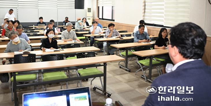진관훈 제주테크노파크 수석연구원이 21일 제주학연구센터에서 열린 '2023 제4회 제주학 주간 및 제7회 제주학대회' 초청 특강에 나서 "제주화전은 도민 정체성과 근현대사의 주요 골격"임을 강조하고 있다. 이상국기자