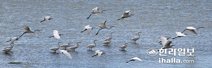 21일 제주시 구좌읍 종달리 해안을 중대백로와 대백로들이 휴식 후 비상하고 있다. 강희만기자