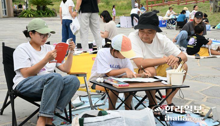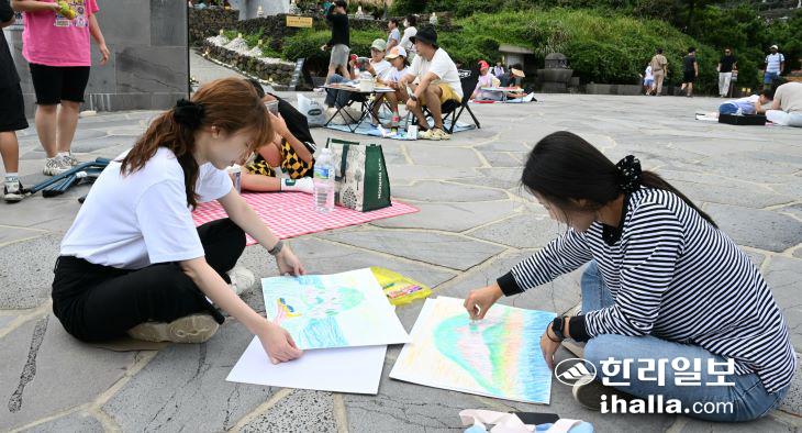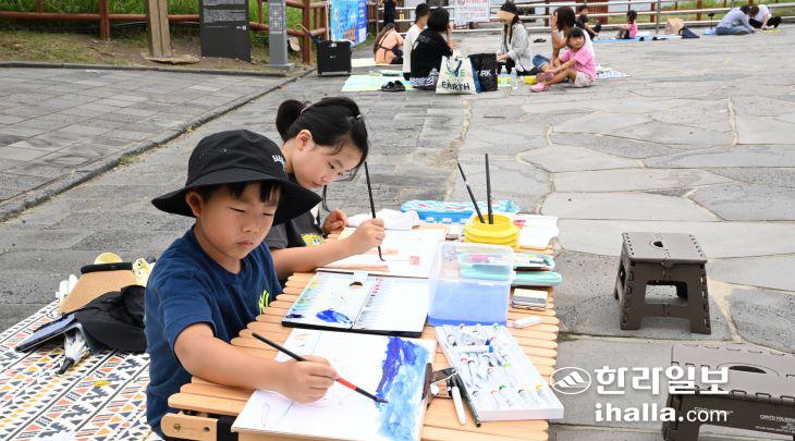 23일 서귀포시 안덕면 사계리 용머리 해안 일대에서 진행된 제1회 제주바다그리기 대회 참가자들. 오은지기자
