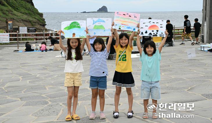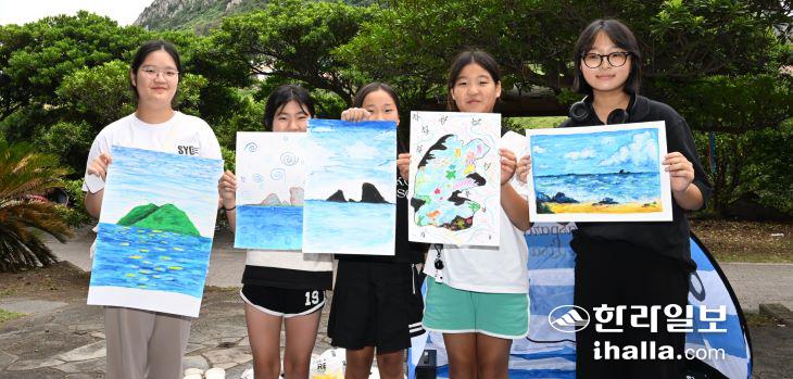 23일 서귀포시 안덕면 사계리 용머리 해안 일대에서 진행된 제1회 제주바다그리기 대회 참가자들이 완성한 그림을 들고 포즈를 취하고 있다. 이상국기자