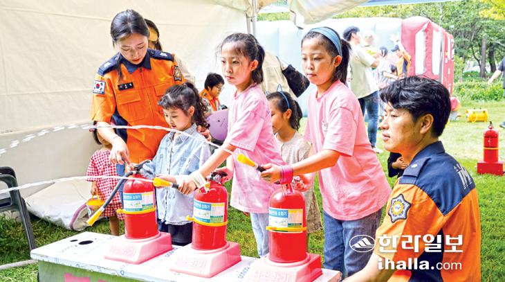 지난 23일 제주시 도남동 시민복지타운에서 열린 제15회 제주 범도민 안전체험 한마당을 찾은 어린이들이 소화기로 불을 끄는 체험을 하고 있다. 이상국기자