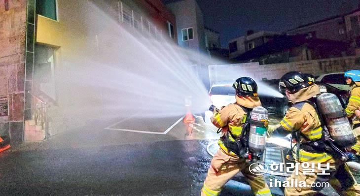 제주소방서는 지난 18일부터 20일까지 3일에 걸쳐 화재 발생시 소방대원의 신속한 현장 도착을 위한 야간 불시출동 훈련을 실시했다.