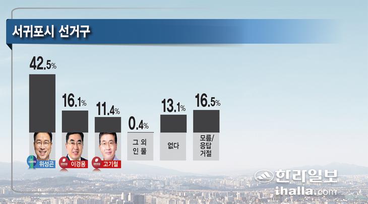 [한라일보] 서귀포시 선거구에서 내년 4월 총선 출마가 거론되는 인물 중 현역인 더불어민주당 위성곤 의원이 42.5%의 지지를 받으며 우세한 것으로 나타났다. 하지만 부동층이 29.6%로 집계돼 변수가 될 전망이다.