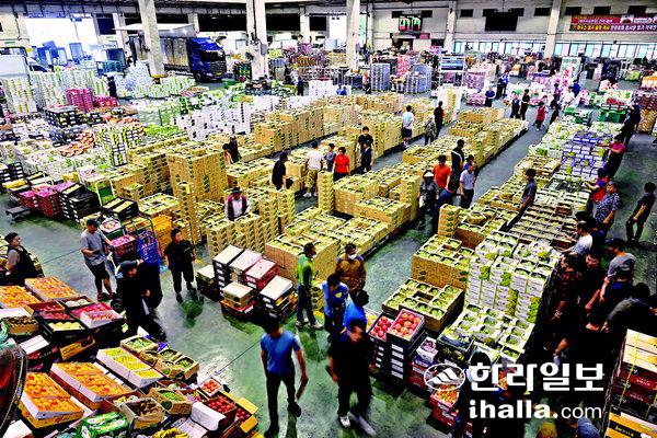 추석을 앞둬 거래량이 크게 늘며 각종 과일이 산더미처럼 쌓여있는 제주시농협 농산물공판장 전경. 강희만기자