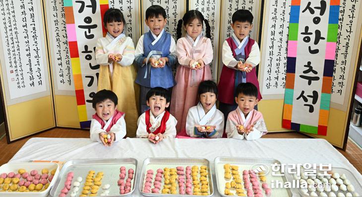 추석을 사흘 앞둔 26일 한복을 곱게 차려입은 제주시 키즈빌어린이집 원아들이 고사리손으로 빚은 송편을 보여주고 있다. 강희만기자