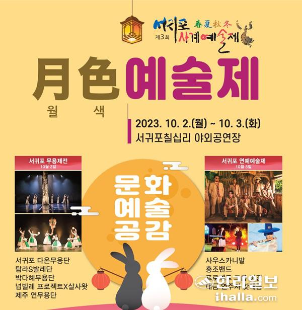 한국예총 서귀포지회는 10월 2~3일 칠십리야외공연장에서 '월색(月色)예술제'란 이름으로 제3회 서귀포 사계예술제를 연다. "서귀포는 그 이름 하나만으로도 시가 되고, 그림이 되고, 음악이 되고, 춤이" 된다며 가을빛을 품은 공연 마당을 펼쳐놓는다.