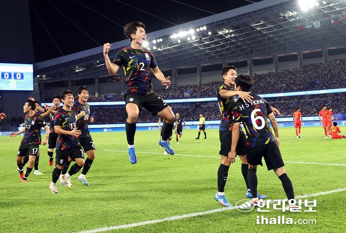 1일 중국 항저우 황룽 스포츠센터 스타디움에서 열린 2022 항저우 아시안게임 남자 축구 8강전 중국과의 경기. 한국 홍현석이 팀 첫번째 골을 넣고 동료선수들과 기뻐하고 있다.연합뉴스