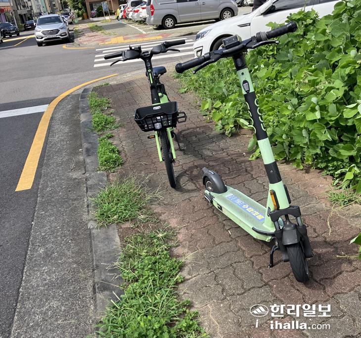 제주도내 인도에 공유 킥보드 2대가 세워져 보행자 통행 불편을 야기하고 있다.
