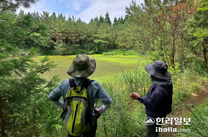 화전민들이 만든 물웅덩이를 취재팀이 살펴보고 있다.