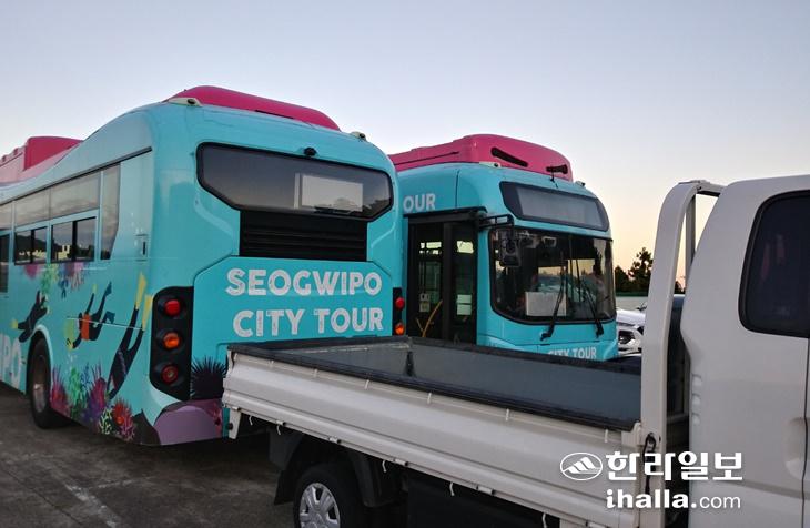서귀포시 토평동 공영버스 차고지에 고장난 채 세워져 있는 '서귀포 시티투어' 전기버스. 진선희기자