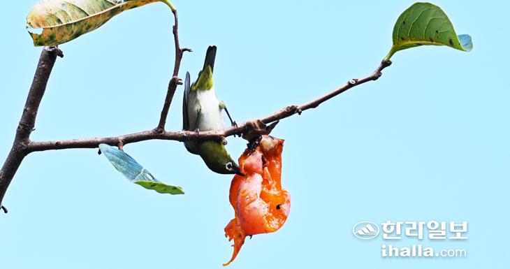 5일 제주자치도의회 정원 감나무에 날아 앉은 동박새가 빨갛게 익은 홍시를 쪼아 먹으며 가을의 풍성함을 즐기고 있다. 강희만기자