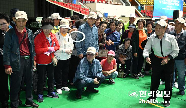 5일 제주시 한라체육관에서 (사)대한노인회 제주특별자치도 제주시지회가 개최한 '제27회 노인의날 기념식 및 제36회 제주시 노인민속경기대회'에 참가한 어르신들이 민속놀이를 즐기고 있다. 강희만기자