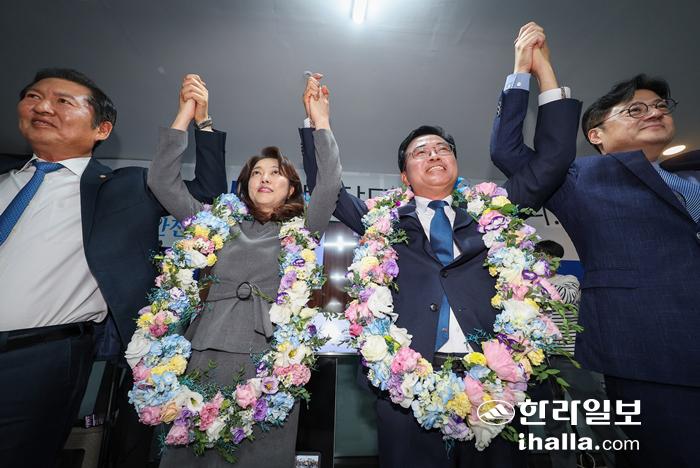 더불어민주당 진교훈 강서구청장 보궐선거 후보가 11일 오후 강서구 마곡동 캠프사무실에서 당선이 확실시 되자 꽃목걸이를 걸고 기뻐하고 있다. 연합뉴스