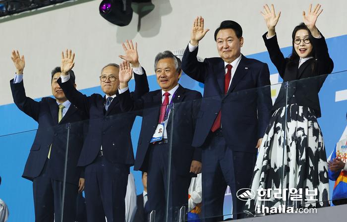 윤석열 대통령과 부인 김건희 여사가 13일 전남 목포종합경기장에서 열린 제104회 전국체육대회 개회식에서 입장하는 선수단을 바라보며 손을 들어 인사하고 있다. 연합뉴