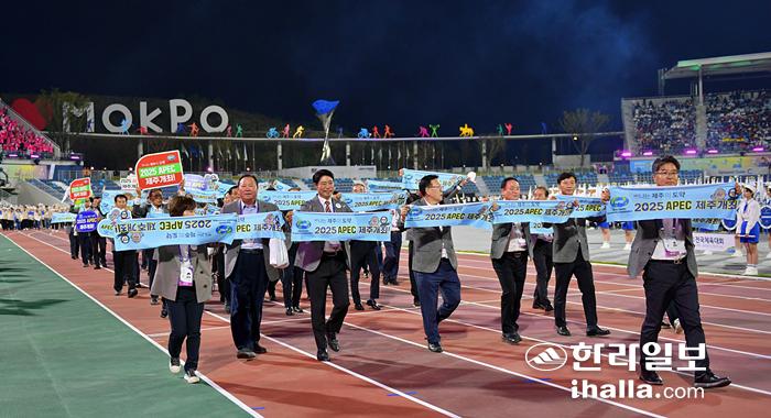 13일 오후 전남 목포종합경기장에서 열린 제104회 전국체육대회 개회식에서 제주선수단이 '2025APEC정상회의 유치' 퍼포먼스를 펼치며 입장하고 있다.