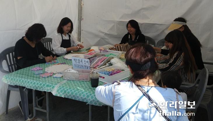 산방산·용머리해안 지질트레일 행사장 부스에서 못 쓰는 양말을 활용한 양말목 공예 체험이 이뤄지고 있다.