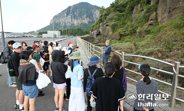 '2023 제주도 세계지질공원 산방산·용머리해안 지질트레일' 마지막 날인 15일 사전 예약자를 대상으로 지질 중심 코스 탐방이 진행되고 있다. 강희만기자