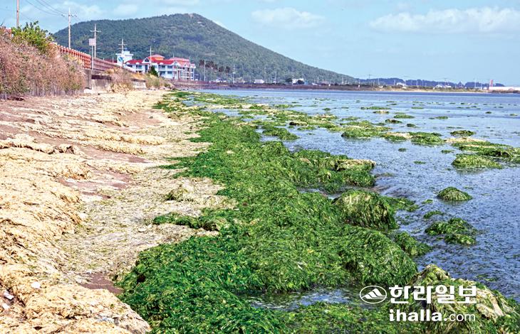 16일 제주시 구좌읍 종달리 해안에 엄청난 양의 파래가 떠밀려와 미관을 해치고 있다. 강희만기자