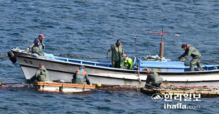 16일 제주시 구좌읍 하도리 앞바다에서 어민들이 고기잡이에 쓰는 덤장의 그물을 손보고 있다. 강희만기자
