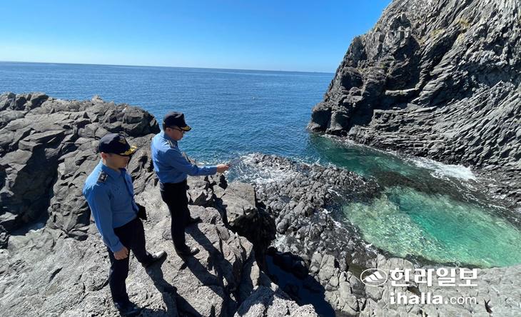 17일 윤태연 서귀포해양경찰서장이 출입통제구역으로 새롭게 지정될 예정인 하원동의 '블루홀'을 찾아 현장 점검을 하고 있다. 서귀포해경 제공