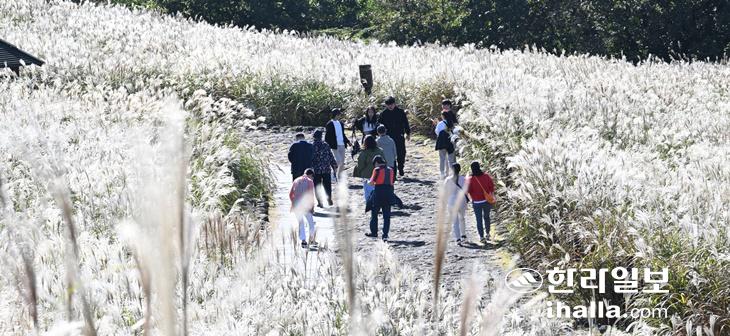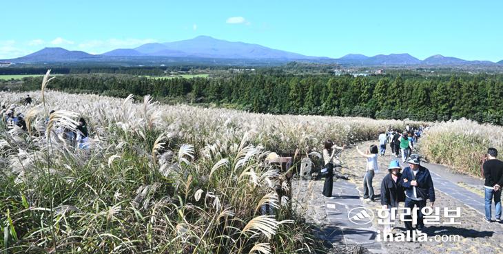 [한라일보] 18일 제주시 조천읍 산굼부리를 찾은 관광객들이 억새와 한라산을 배경으로 기념사진을 찍으며 추억을 새기고 있다. 제주지방은 20일 오전 비가 내린 후 기온이 내려가면서 쌀쌀해질 것으로 보인다. 이상국기자