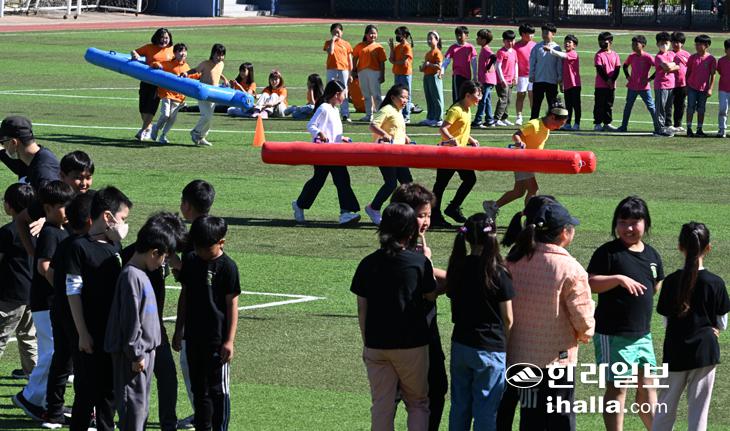 18일 제주시 외도초등학교 어린이들이 가을운동회에서 게임을 하며 즐거운 시간을 보내고 있다. 강희만기자