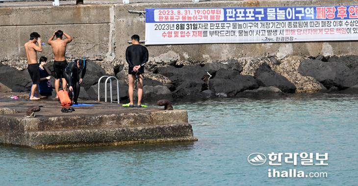 19일 오전 물놀이구역 폐장 후 안전 안내문이 걸려있는 제주시 한림읍 판포포구에 사람들이 찾아 물놀이를 즐기고 있다. 강희만기자