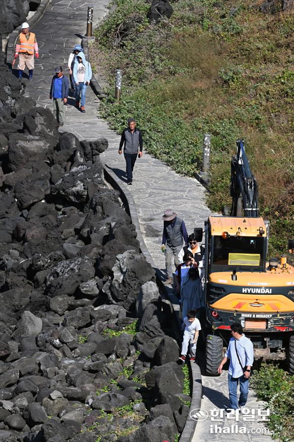 19일 제주시 애월읍 한담산책로에서 관광객들이 중장비 차량을 이용해 이뤄지고 있는 탐방로 보수 공사 구간을 아슬아슬하게 지나고 있다. 강희만기자