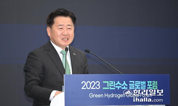 23일 제주국제컨벤션 센터에서 '2023 그린수소 글로벌 포럼' 개회식에서 오영훈 제주도지사가 환영사를 발표하고 있다. 이상국기자