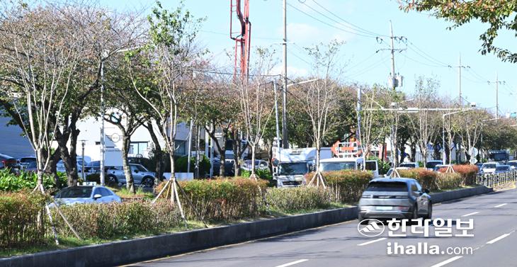 제주시 연삼로에 조성된 녹색공간 조성사업. 기존 도로 중앙에 설치된 무단횡단 금지 시설을 철거하고 식수대를 조성해 도심을 녹색공간으로 재탄생시켰다. 이상국기자