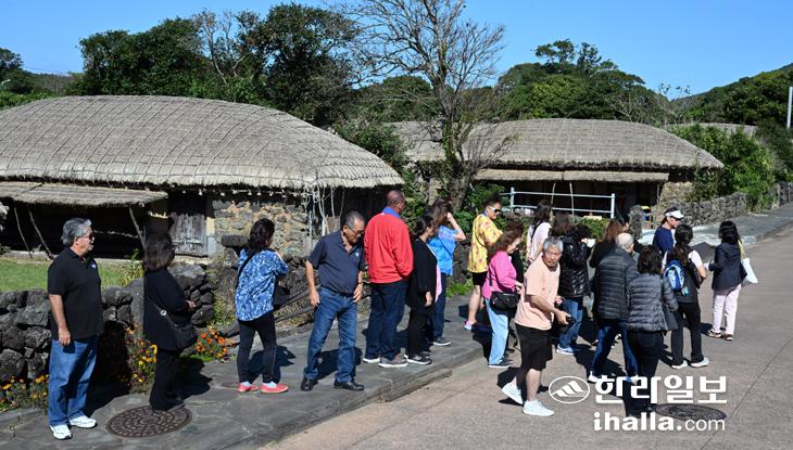 청명한 가을 날씨를 보인 23일 서귀포시 표선면 성읍민속마을을 찾은 외국인 관광객들이 제주의 전통 초가마을을 둘러보고 있다. 강희만기자