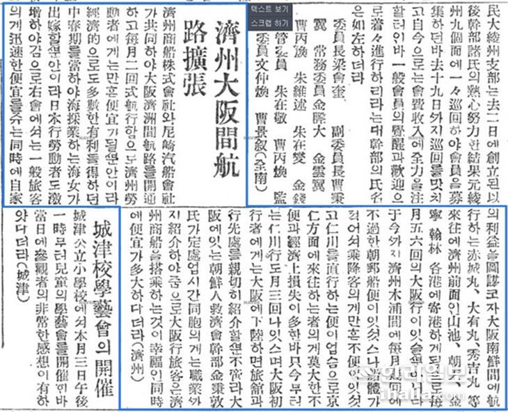▶연재 취지=제주-오사카 직항로의 개설은 일본자본에 휘둘린 게 아니라 제주사람들의 일본 진출 의욕과 향토자본의 선도에 따른 결과였다. 1920년대 부산에서 관부선을 타고 오사카로 향하던 제주사람들이 직항로를 개척한 것이다. 1923년, 1924년 조선일보에는 '제주대판항로'라고 명기하여 눈길을 끈다. 통상 '관부선(關釜船)'이라고 부르던 사실에 비추어보면, 제주를 중심에 둔 자주적인 움직임이 눈에 띈다.