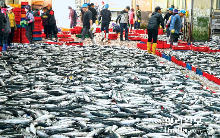 24일 제주시수협 위판장에서 어민들이 제주 근해에서 잡아올린 고등어를 크기별로 분류하고 있다. 강희만기자