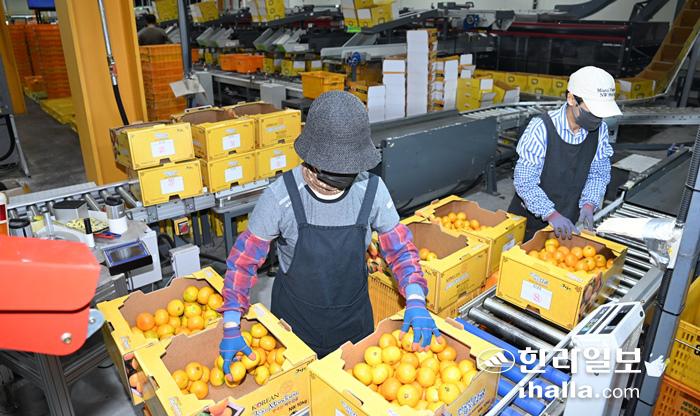 26일 제주감귤농협 제8 유통센터에서 올해 첫 감귤 수출을 하기 위해 감귤 선과 및 포장 작업을 하고 있다. 이상국기자