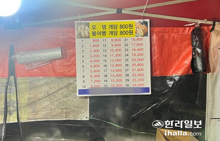 실제 제주시내 붕어빵 노점 3곳을 돌아본 결과, 붕어빵 가격은 1개 700원~800원이었고, 3개에 2000원에 판매하는 곳은 1곳이었다. 붕어빵과 같이 판매하는 어묵도 마찬가지로 1개 700~800원이었다.