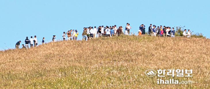 완연한 가을날씨를 보인 29일 제주시 애월읍 봉성리 새별오름 정상에 오른 탐방객들이 파란 하늘 아래서 가을 정취를 한껏 느끼고 있다. 강희만기자
