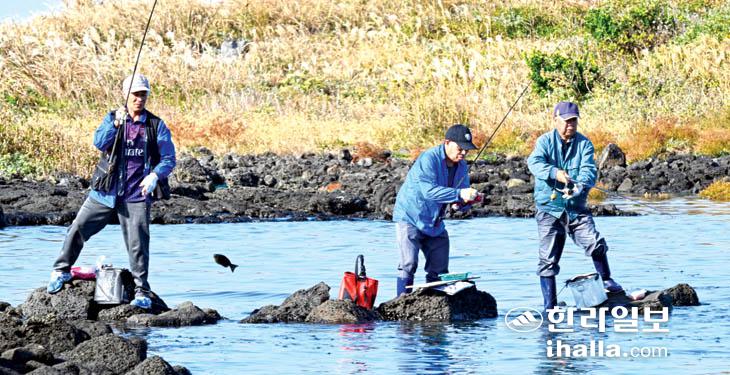29일 제주시 조천읍 해안가에서 마을주민들이 벵에돔 낚시를 즐기고 있다. 이상국기자