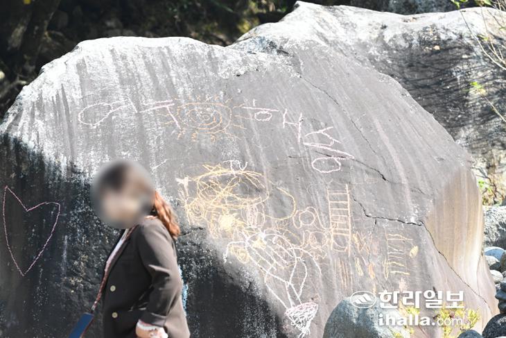 천아계곡 내 바위가 온갖 낙서로 얼룩져있다. 이상국기자
