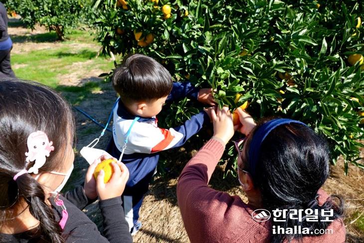 감귤박물관 체험장에서 방문객들이 감귤 따기 체험을 하고 있다. 서귀포시 제공