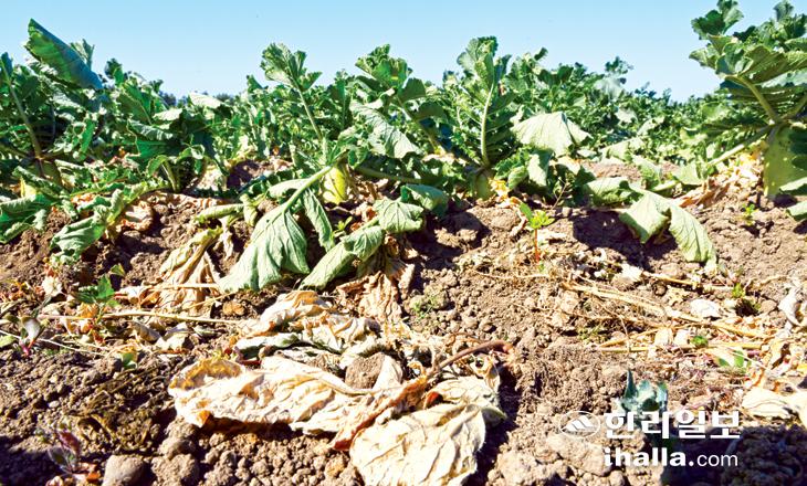 월동무는 잎마름 현상이 나타나고 있다. 강희만기자