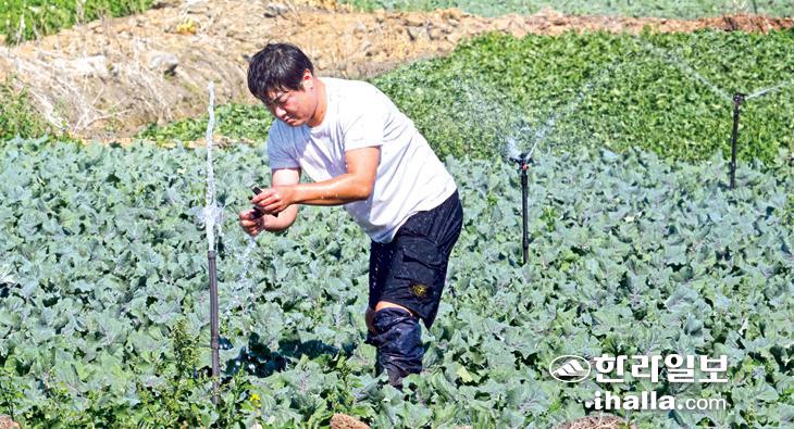 31일 서귀포시 대정읍에서 농업인이 콜라비 밭의 스프링클러를 점검하고 있다. 강희만기자