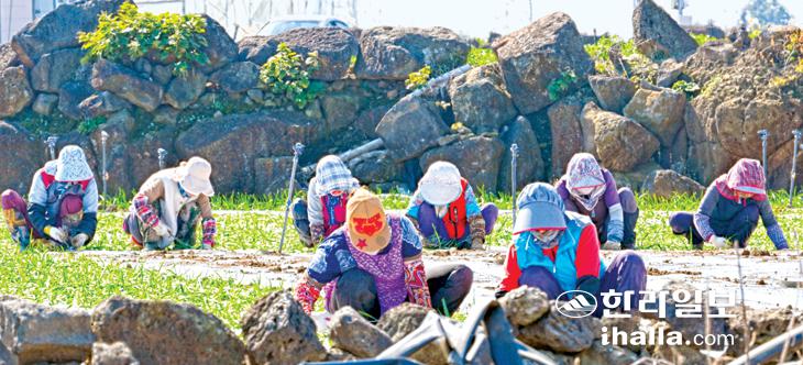 31일 서귀포시 대정읍 하모리 한 마늘밭에서 농민들이 마늘새싹 정리작업을 하고 있다. 강희만기자