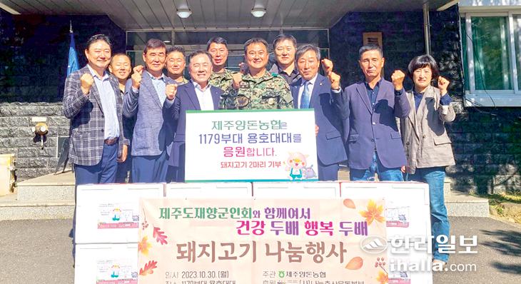 제주양돈농협(조합장 고권진)은 '함께여서 건강 두배 행복 두배 제주도니 나눔' 행사의 일환으로 지난달 30일 육군 1179부대 용호대대을 방문, 돼지고기 두마리(160㎏)분을 전달했다.