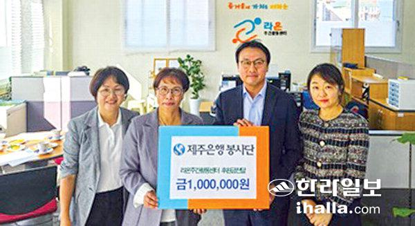 제주은행봉사단(단장 문종일)과 제주은행 연북로지점(지점장 박상언)은 지난달 31일 라온주간활동센터(센터장 김명열)을 찾아 후원금 100만원을 전달했다. 이번 성금은 지역사회 소외된 장애인가정을 돕기 위해 제주은행 직원들이 자발적인 마음과 뜻을 담아 마련했다.