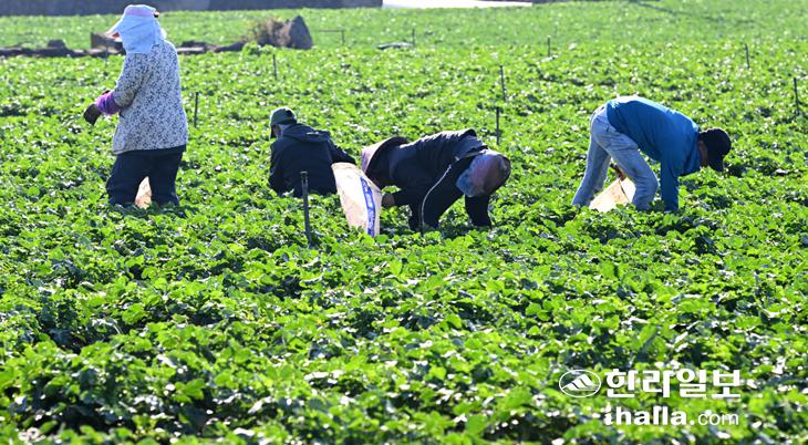 2일 서귀포시 대정읍 일과리의 한 월동무밭에서 농민들이 김매기작업을 하고 있다. 강희만기자