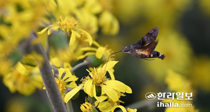 5일 제주시 오라동 도로변에 털머위꽃이 만개하자 박각시나방이 찾아와 꿀을 따먹고 있다. 강희만기자