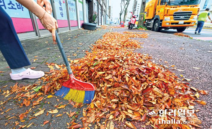 전날부터 내린 비로 제주시 서사로 일대 가로수 잎이 떨어지자 주변 상인들이 6일 오전 낙엽을 쓸고 있다. 강희만기자