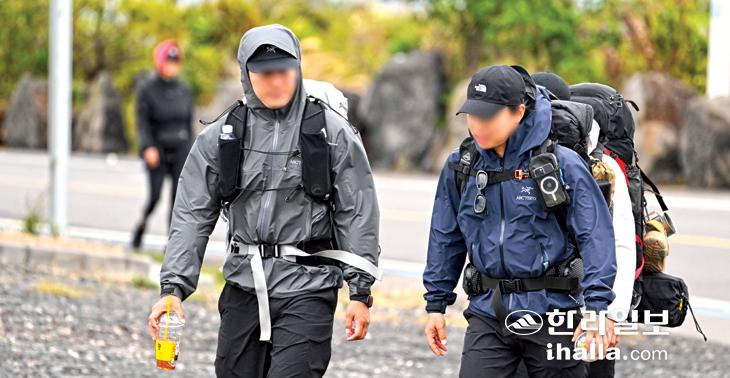 갑작스럽게 추위가 덮친 6일 제주시 조천읍 해안도로를 찾은 탐방객들이 몸을 움츠린 채 걸어가고 있다. 강희만기자