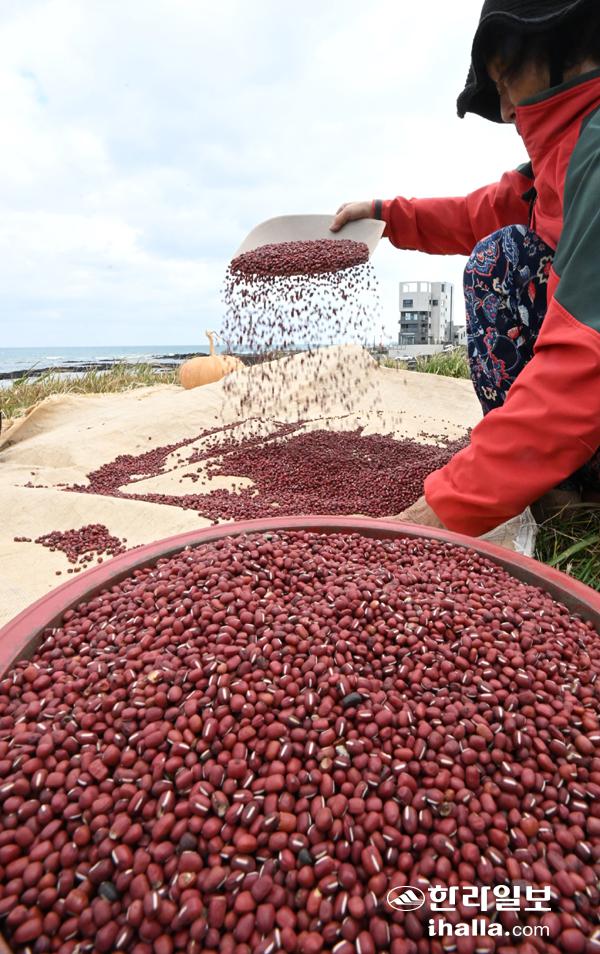 7일 제주시 구좌읍 해안에서 한 농민이 바람에 수확한 팥 불리기 작업을 하고 있다. 이상국기자
