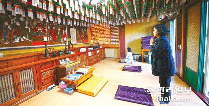 수능을 일주일여 앞둔 8일 제주시 천왕사를 찾은 학부모가 수능기도를 올리고 있다. 이상국기자